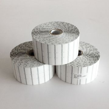-Carton de 6 bobines d’étiquettes bijouterie 8000D en polypropylène thermique avec rabat format 56mm x 13mm en mandrin de 25mm adhésif acrylique permanent. Bobine de 3510 étiquettes, soit 21060 étiquettes par carton.