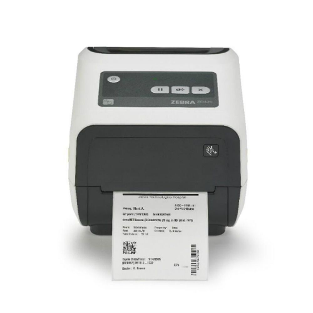 -Imprimante étiquette de bureau HEALTHCARE Zebra ZD421 avec Cartouche, transfert thermique en 300 dpi et 102 mm de largeur d’impression, RTC, interface Ethernet 10/100, USB, hôte USB, BTLE, 512Mo de mémoire Flash et 256Mo de SDRAM.