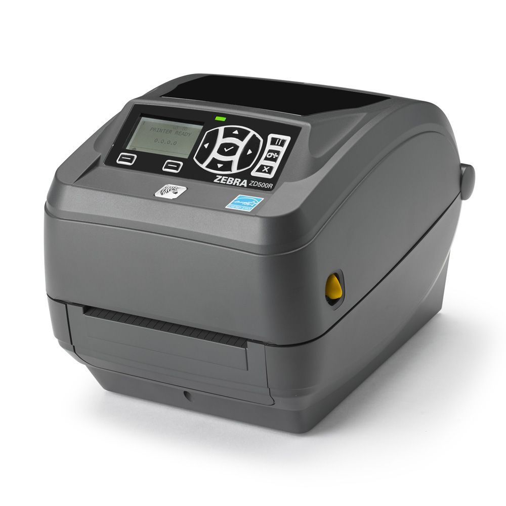 -Imprimante étiquette de bureau Zebra ZD500 RFID avec encodeur UHF, transfert thermique en 203 dpi et 104 mm de largeur d’impression, avec option massicot, interface série, parallèle, USB et Ethernet, 256Mo de mémoire Flash, 128Mo de SDRAM.