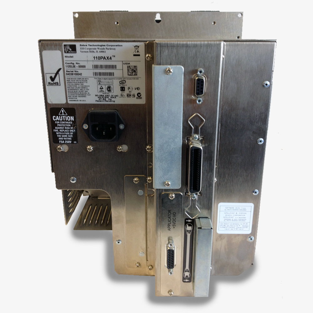 -Bloc d’impression 110PAX4 transfert thermique, 300 dpi, ZPL, version droite, série, parallèle, Zebranet b/g radio (carte radio inclus) avec 4Mo de mémoire flash et carte applicateur Entrée/Sortie 5V.