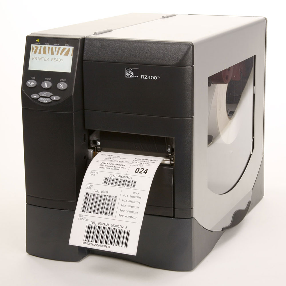 -Imprimante étiquette industrielle Zebra RZ400 avec encodeur RFID (UHF), transfert thermique en 203 dpi et 104 mm de largeur d’impression, ZPL, 64Mo de mémoire flash, avec massicot, Zebranet interne 10/100 et Zebranet b/g radio.