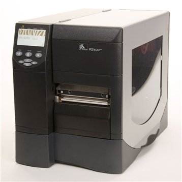 -Imprimante étiquette industrielle Zebra RZ400 avec encodeur RFID (UHF), transfert thermique en 300 dpi et 104 mm de largeur d’impression, ZPL, 64Mo de mémoire flash, décollement avec rembobiner silicone uniquement, Zebranet interne 10/100 et Zebranet radio (carte radio non incluse).
