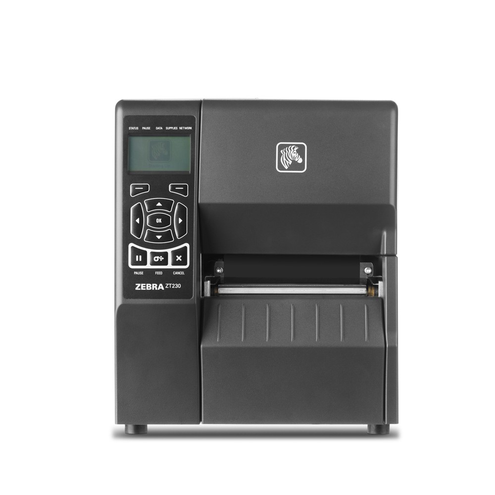 -Imprimante étiquette industrielle Zebra ZT230, langage ZPL et EPL, 203 dpi, transfert thermique avec massicot et port USB, série et Zebranet interne 10/100.